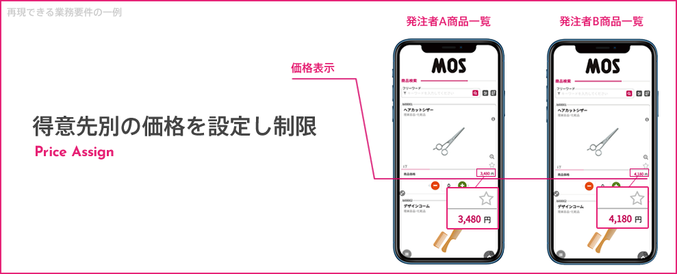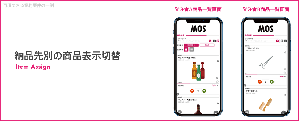 MOSには標準機能に商品割当機能が搭載されています。取引先毎に見せたい商品を割り当てることにより商品表示の切り替えが可能です。