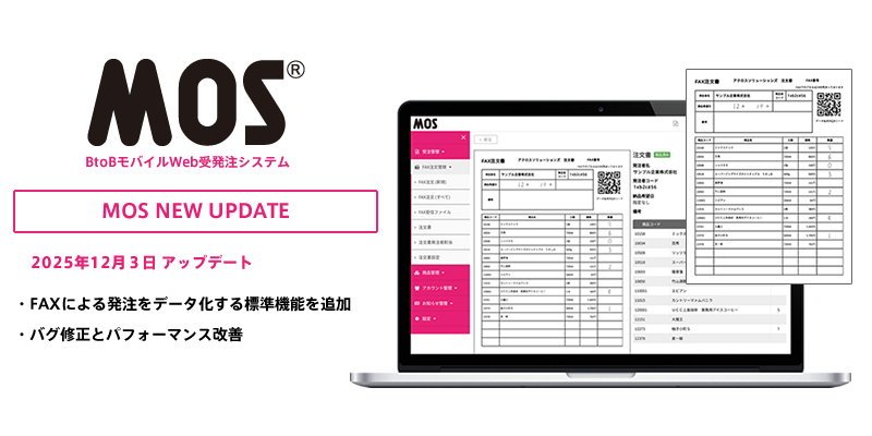 バージョンアップ2025年12月3日、弊社のBtoBモバイルWeb受発注システム「MOS」に新機能「MOS FAX」を追加するアップデートを実施し、提供を開始しました。