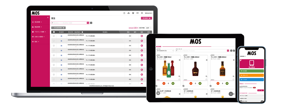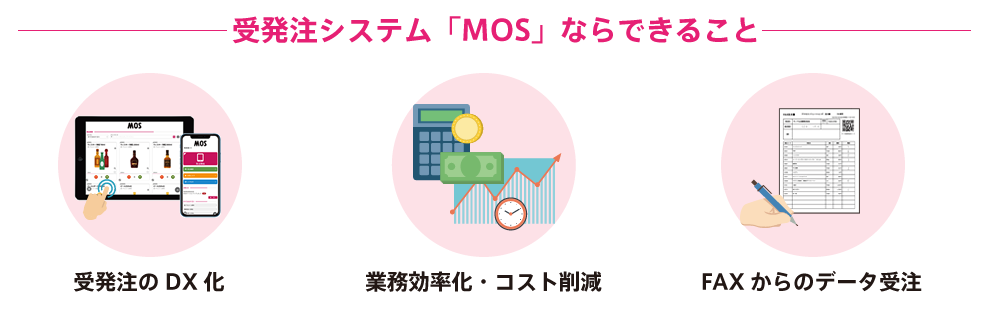 受発注システム「MOS」は、現在FAXや電話で行っている受注・発注業務や、受注内容を手入力でシステムやファイルにまとめるといったアナログな業務を、スマホ・タブレット・PCでDX化できるシステムです。