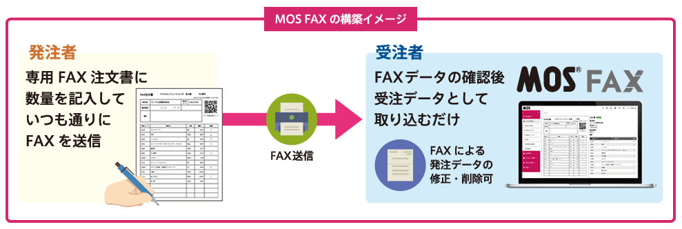 MOSの機能やメリットはそのままに、MOS FAXもご利用いただけます。今まであきらめていたFAX受注も、もう心配ありません。