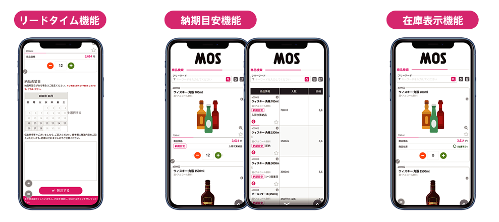 「リードタイム機能」や「納期目安」、「在庫表示」など、発注時に確認したくなる情報を、MOSがしっかりサポート。各種機能により、発注者の不安を軽減し、安心して使える環境を提供します。