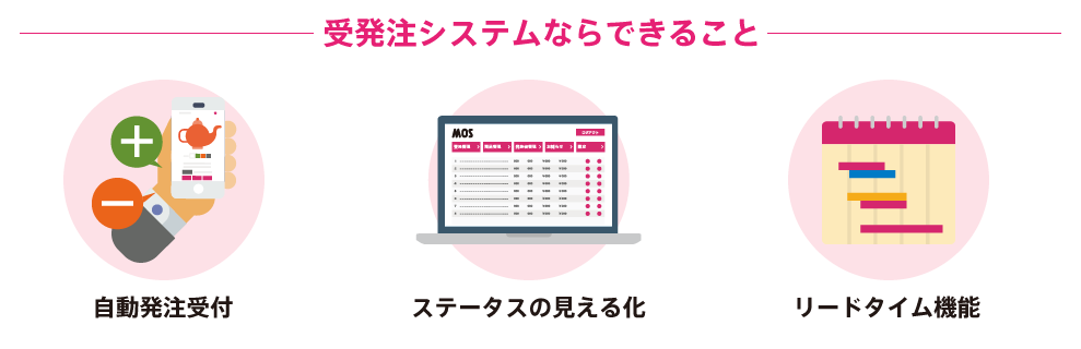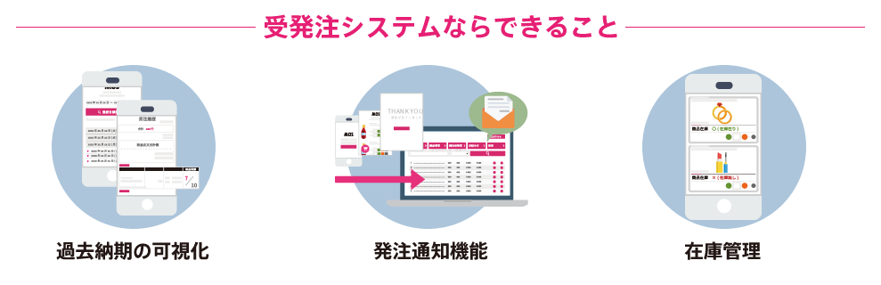 基幹システム弊社の受発注システム「MOS」をお客様に導入いただく際には従来のメリットである「業務効率化」、「負荷軽減」、「業種業態にあった機能やしくみ、カスタマイズ」をご案内させていただくと同時に普段では気づくことができない“無駄”を潰すことができる点も説明しております。