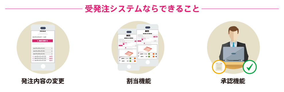 受発注システムなら「締切時間までの発注内容の変更」、「発注者・取引先の割当機能」、「承認フロー機能」といった機能があり、判断に迷う場面を大幅に減らすことができます。
