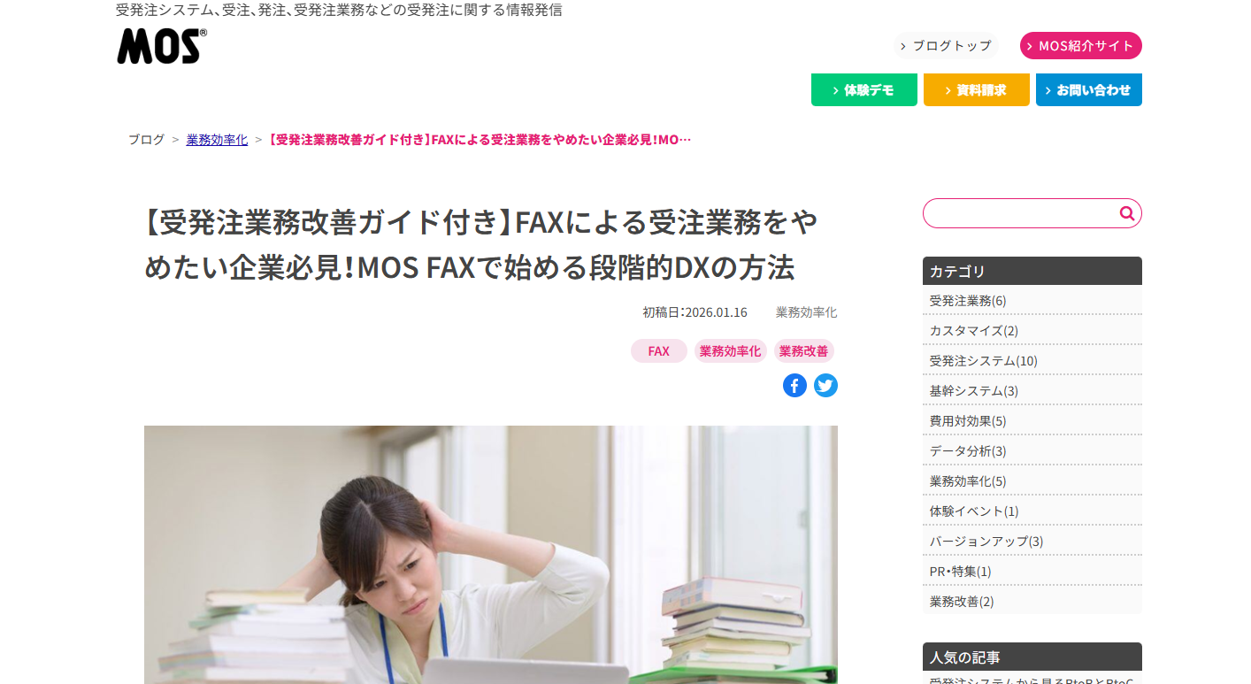 受発注コラム 「【受発注業務改善ガイド付き】FAXによる受注業務をやめたい企業必見!MOS FAXで始める段階的DXの方法」を掲載いたしました。