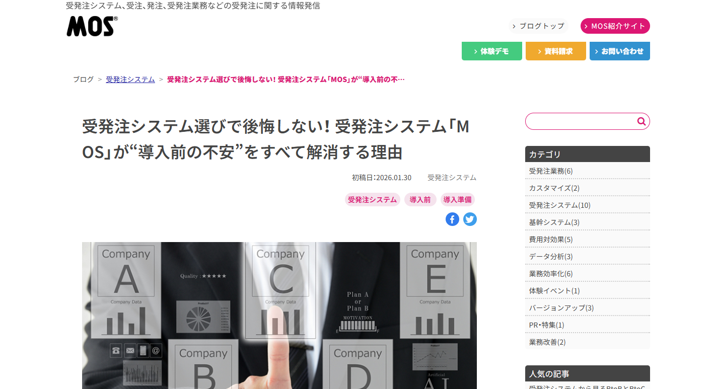 受発注コラム 「受発注システム選びで後悔しない! 受発注システム「MOS」が“導入前の不安”をすべて解消する理由」を掲載いたしました。